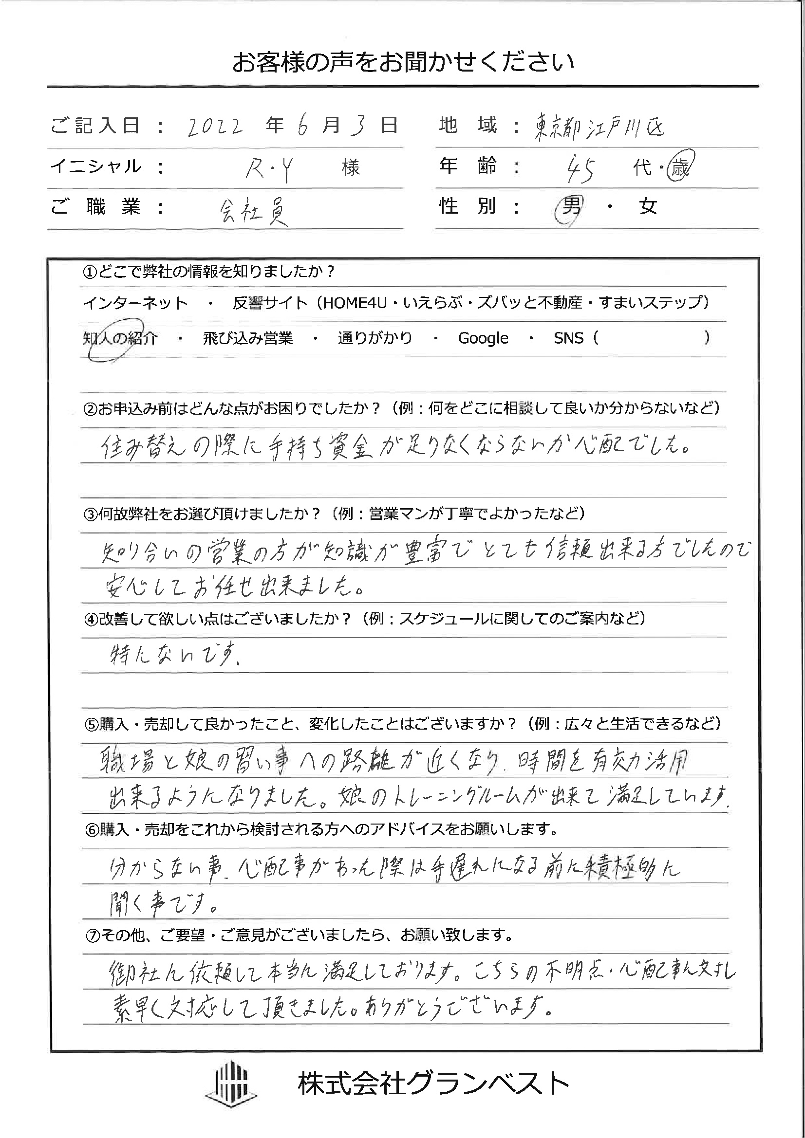 船橋市の戸建て探し・投資情報|【株式会社グランベスト】 > 株式会社グランベストのスタッフブログ記事一覧 > お客様の声を頂きました